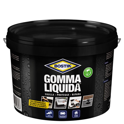 Note: Il nuovo Bostik Gomma Liquida rappresenta una vera e propria innovazione nell'ambito della impermeabilizzazione. Si tratta di un rivestimento a base di polimeri modificati idoneo per impermeabilizzare al 100%, all'aria e all'acqua, praticamente tutte le superfici sia in interno che in esterno. Un unico prodotto, 3in1, che vi permetterà di sigillare, proteggere e riparare legno, cemento, pietra, metalli, zinco, alluminio, bitume, pvc e praticamente ogni superficie comprese quelle umide, con una buona adesione anche su polipropilene e polietilene (PP/PE).
